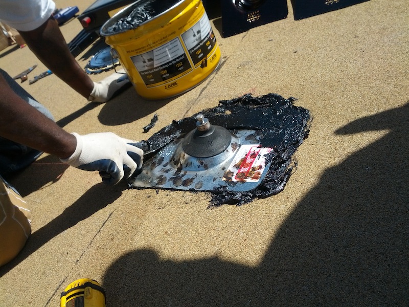 Ron starts applying APOC 133 roof sealant around jack. Behind him you can see the Oatey flashing that have been sprayed with the sealant primer - a sticky black coating on both sides.